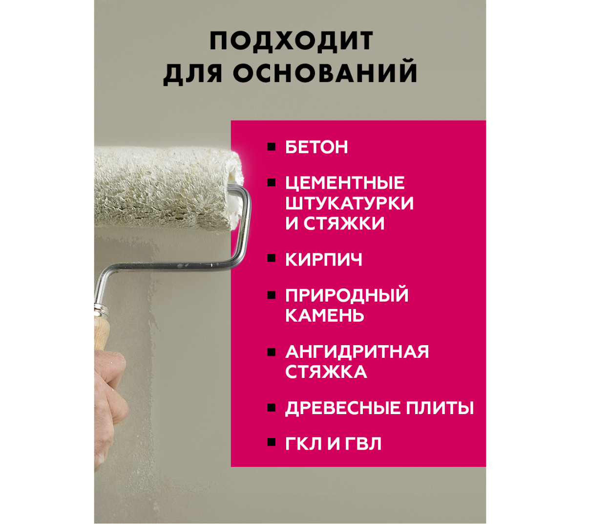 - Все впитывающие основания: кирпичная, бетон, ячеистый бетон, цементная штукатурка