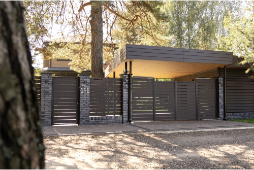 Забор «жалюзи» производится в разных цветовых решениях, в том числе цвета под дерево, что придает ограждению натуральный естественный вид. Матовые и глянцевые покрытия ламелей. Элементы ограждения собираются как конструктор, что позволяет выполнить монтаж своими силами.
