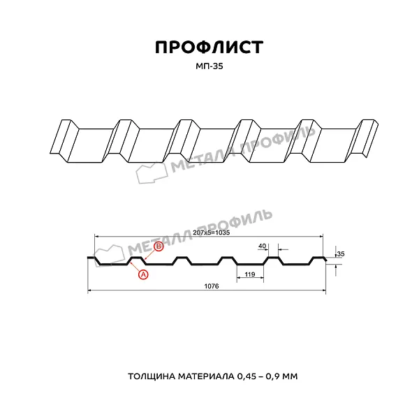 Профлист МЕТАЛЛ ПРОФИЛЬ МП-35x1035-B (ОЦ-01-БЦ-0,5) часто используется для обустройства профилированного листа. Представляет собой лист оцинкованной стали с покрытием. Общая толщина стальной основы с оцинковкой и декоративно-защитным покрытием составляет 0.5 мм. После проката на специальном оборудовании металл принимает волнообразный вид. Такая конфигурация придает профилю несущую способность.Профиль МП-35: